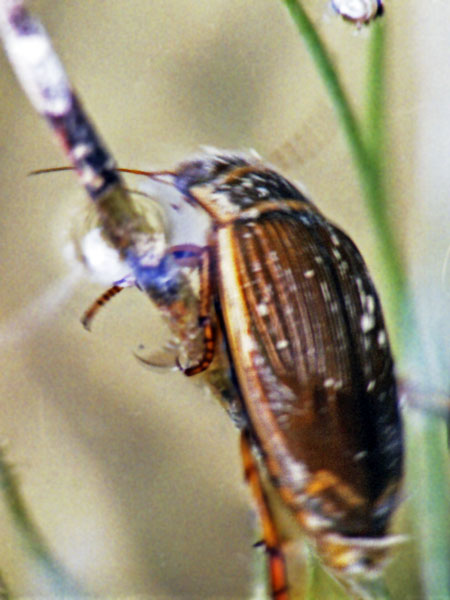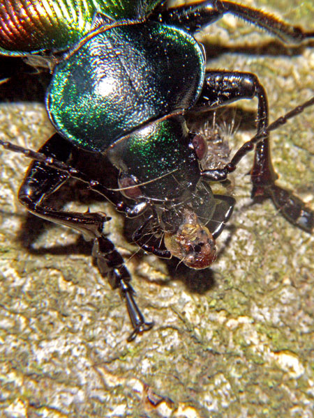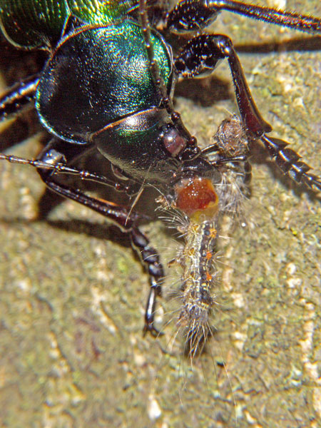 Unzähliege der großen, buntschillernden Käfer machten sich über eine Invasion der Raupen des Schwammspinners, Lymantria dispar her. Wie auf Verabredung waren die Käfer und die Raupen zur gleichen Zeit da.