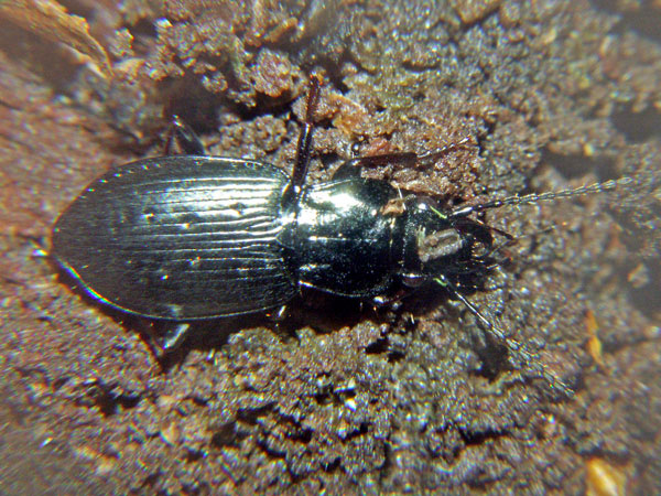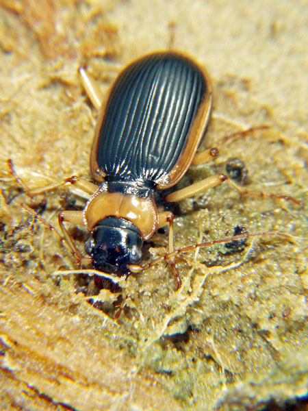 Carabus granulatus ♀, mit kupferfarbenem Halsschild und erheblich größer als obiger Carabus granulatus aber kleiner als Carabus cancellatus. Unter gleicher Rinde von Eichentotholz, hier waren sechs Käfer auf engem Raum im Winterschlaf. Gesehen am 13.02.2008 bei Langenberg/NRW..