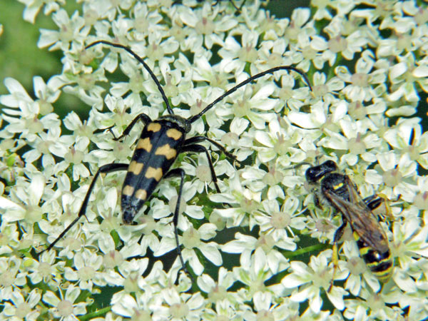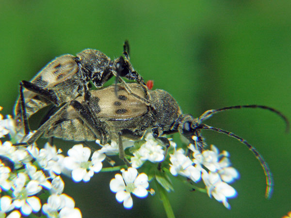 Bockkäfer Pärchen auf Schafgarbe, Achillea millefolium. Finnland August 1999.