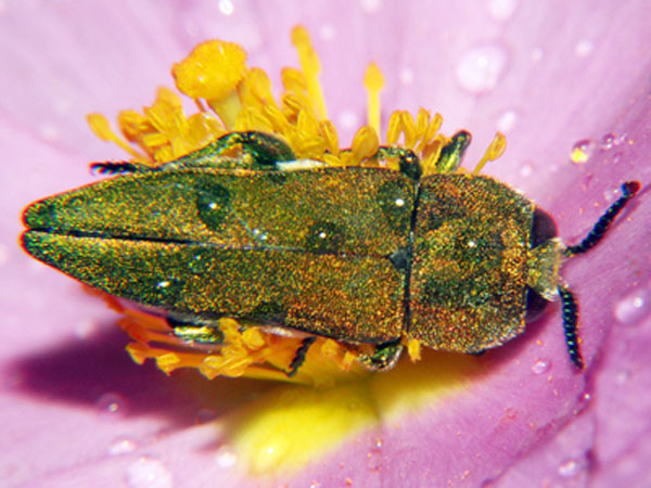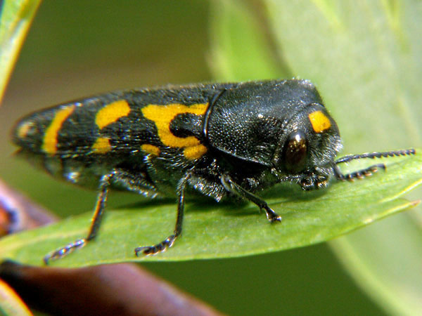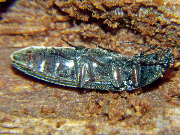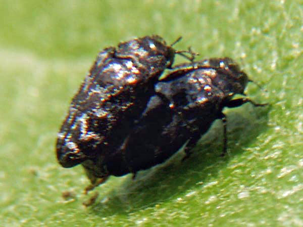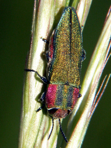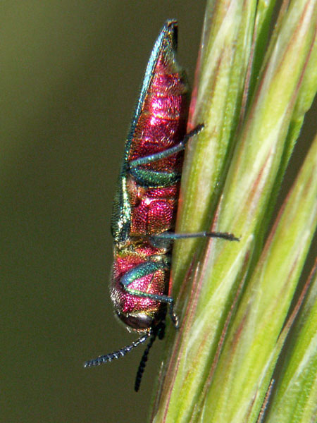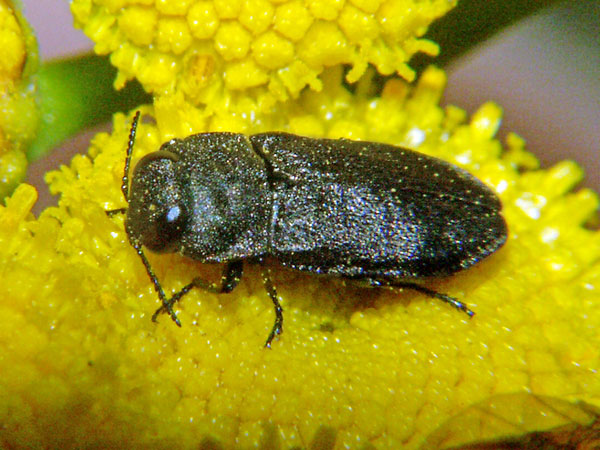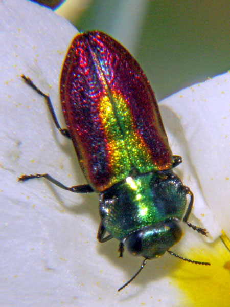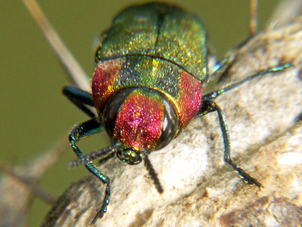 Diese Prachtkäfer sind nur 2-3 mm groß. Ich hielt sie erst für Zikaden, wurde dann aber aufgeklärt. Üblicher Weise leben die Käfer oben in den Baumkronen, sind deshalb selten zu sehen.