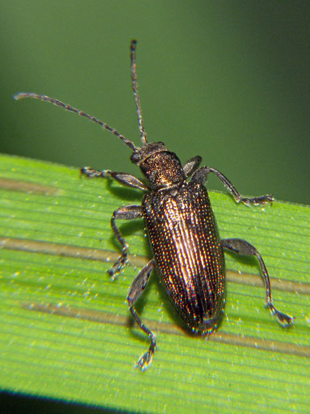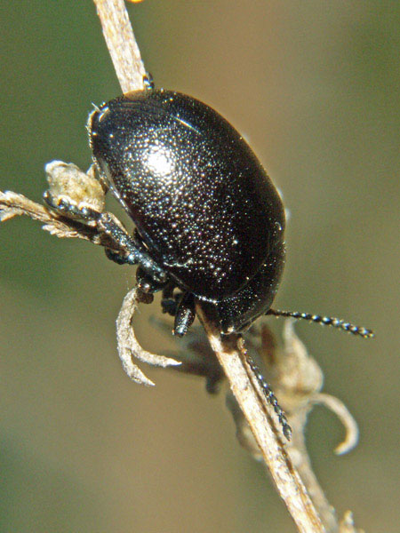 Etwa 2 mm großer Blattkäfer am Zierteichufer, Stadtrand Essen/NRW.