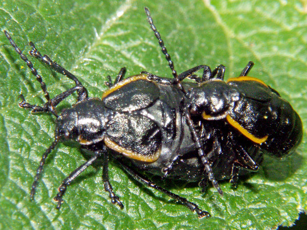 Pappelblattkäfer gab es an dem bekannten Platz am Buech sehr viele. Diese waren in Hochzeitsstimmung. Gesehen Anfang Mai 2007 am Buech, Provence.