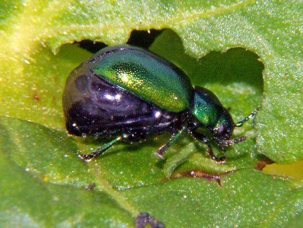 Etwa 4 mm großer Blattkäfer am Zierteichufer, Stadtrand Essen/NRW.