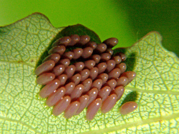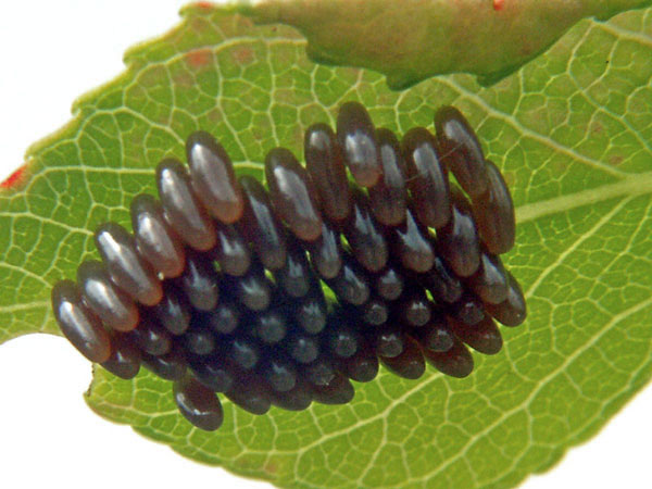 Das Ergebnis dieser Hochzeit, Pappelblattkäfereier unter einem Pappelblatt. Gesehen Anfang Mai 2007 am Buech, Provence.