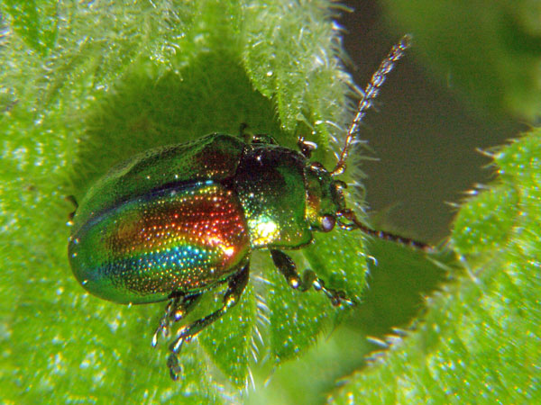 Unterfamilie: Chrysomelinae. Etwa 4 mm großer Blattkäfer am Zierteichufer, Stadtrand Essen/NRW. An dem recht naturnah gestalteten Zierteich wuselten unzählige dieser Käferchen.