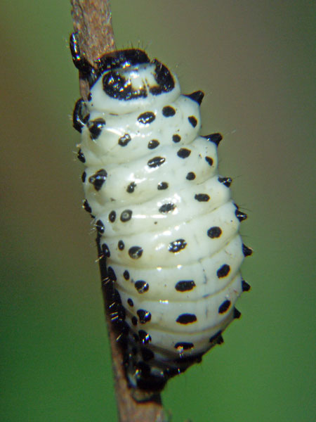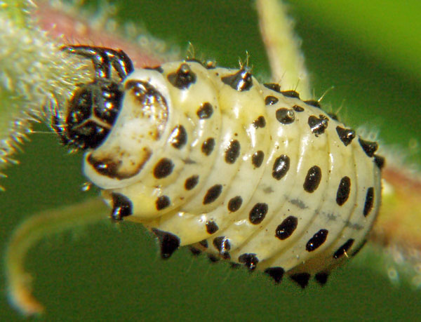 Gonioctena quinquepunctata Larven auf Traubenkirsche, Prunus padus.