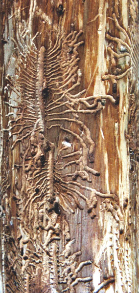 Fraßspuren des Buchdruckers, Ips typographus, eines etwa 5 mm großen Käfers.