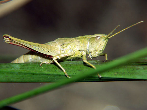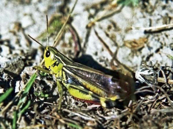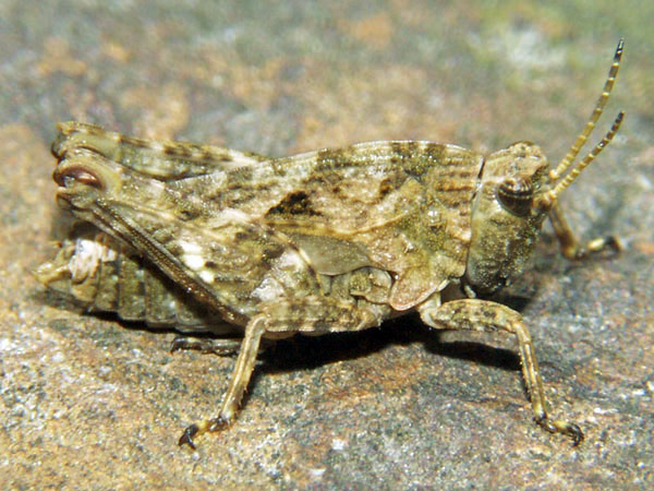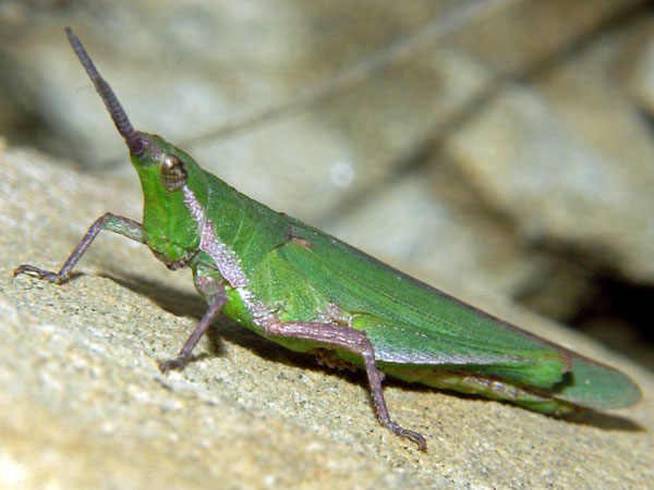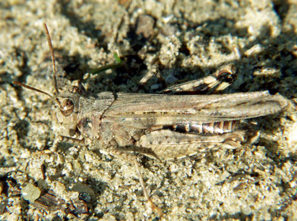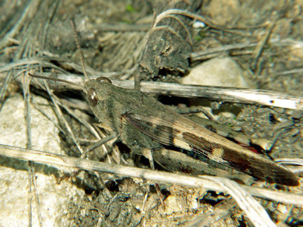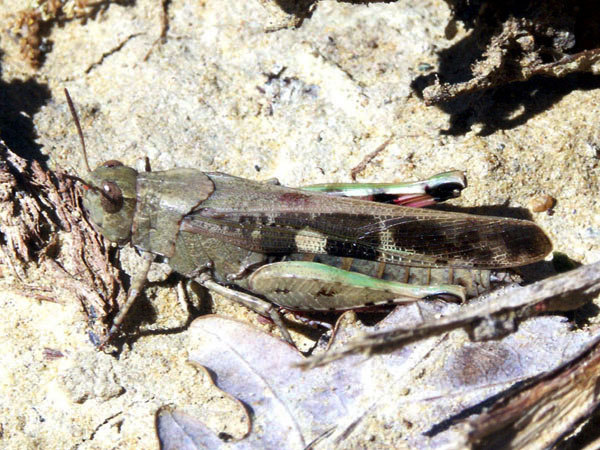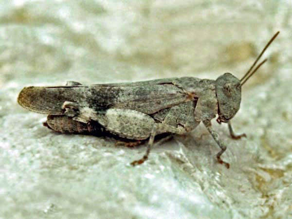 Familie Acrididae, Unterfamilie: Feldheuschrecken. Gesehen am 6. Mai 1997 bei Oppedette am Calavon, Süd-Frankreich.
