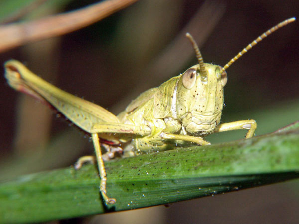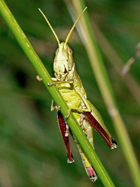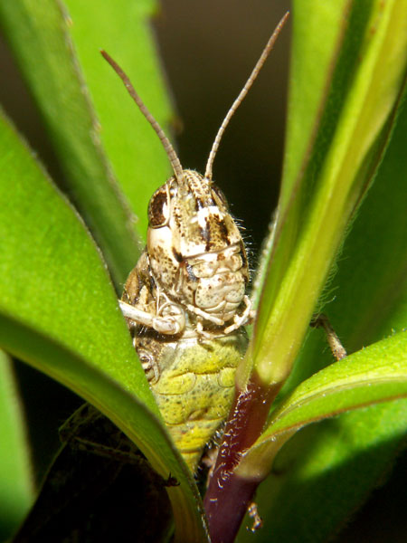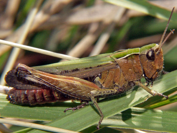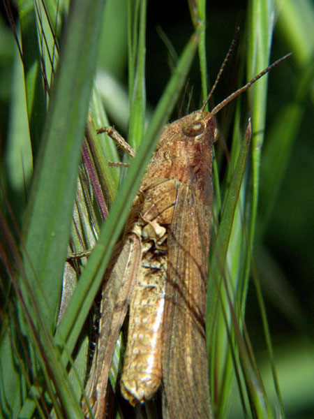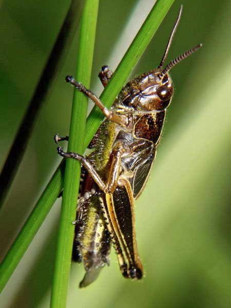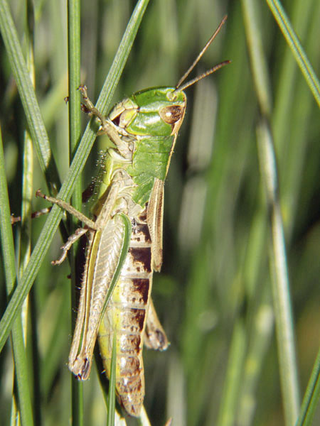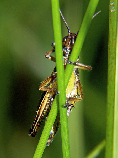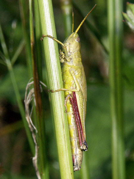 Stethophyma grossum, Nymphe. Die ist ziemlich neugierig, wie sie durch die Grashalme schaut!