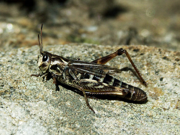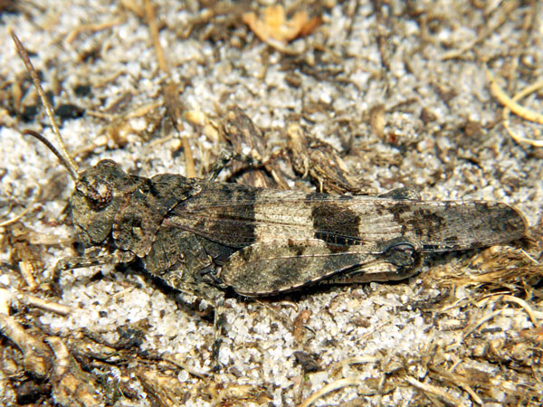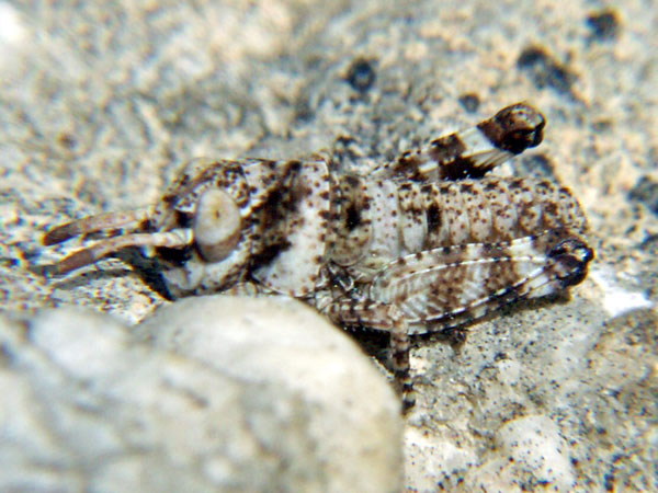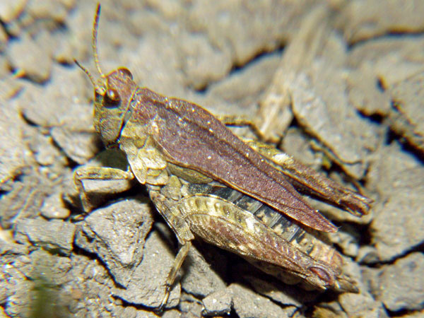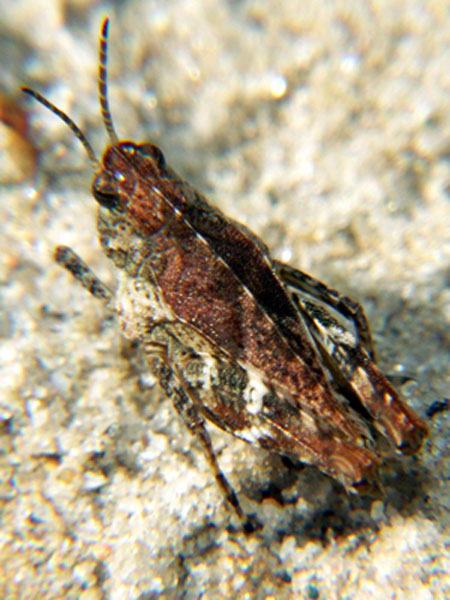 Familie: Catantopidae, Knarrschrecken. Auf vegetationsarmen Plätzen kommt die Schönschrecke recht häufig vor. Allerdings lässt sie sich wie auch andere Schrecken ungerne photographieren, kaum hat man den Photoapparat eingestellt, hüpfen sie auch schon fort.