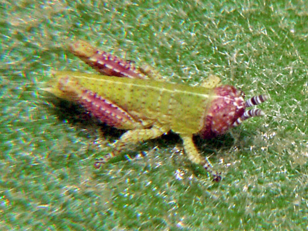 Familie Acrididae, Unterfamilie: Feldheuschrecken. Sehr kleiner Grashüpfer aus Süd-Frankreich, Provence. Photographiert Juni 2006.