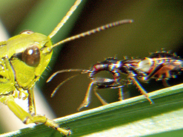 Während ich die Stethophyma grossum ♂ photographierte, kam eine Wanzenlarve vorbei, neugierig betrachteten sich die Insekten.