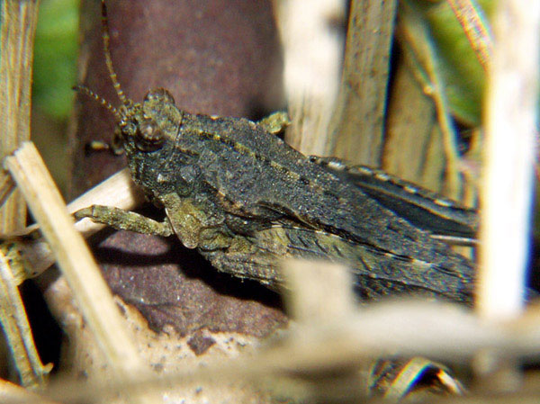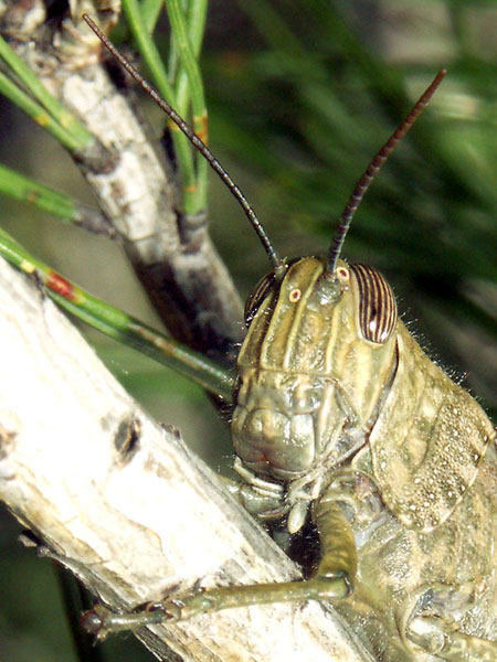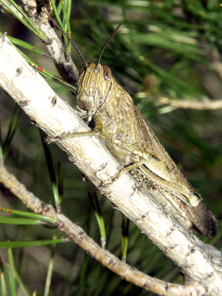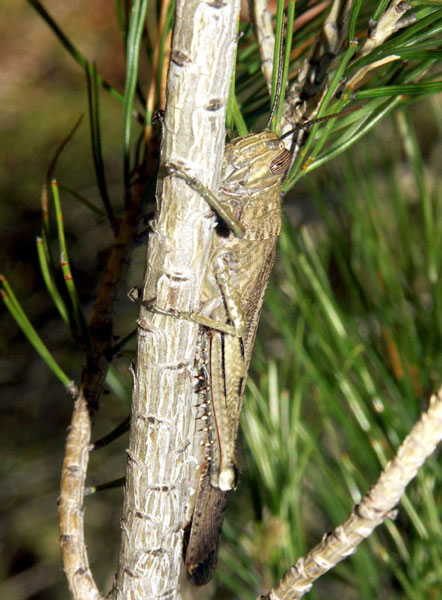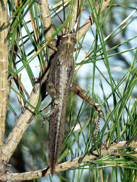 Familie: Cantopidae, Knarrschrecken. Die Ägyptische Wanderheuschrecke hat einen denkbar schlechten Ruf. Wenn sie wie im Mai 2007 vereinzelt auftritt, ist er unberechtigt. Gesehen am 10. Mai bei Bidon oberhalb der Ardèche-Schlucht. Ich scheuchte die Schrecke bei einer Wanderung vom Boden auf und konnte ihren Flug bis in die Kiefer verfolgen.