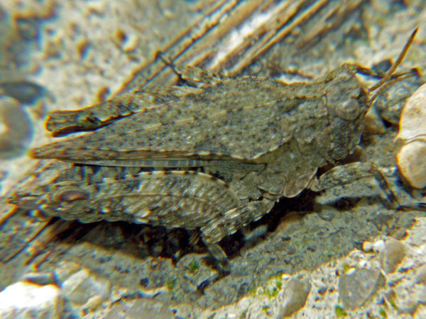 Diese Schnarrschrecken gibt es mit roten und blauen Flügeln. Beim Flug werden auch die farbigen Hinterflügel sichtbar, dann kann man die Arten sicher unterscheiden. Die Männchen fliegen mit einem laut klappernden Schnarrton, was ihnen den Namen gab.