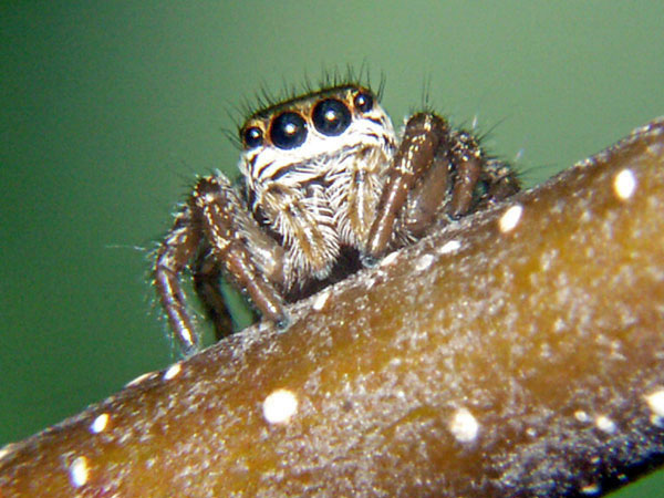 Mitbewohner, Essen Nordrhein-Westfalen. Diese Springspinne ist mit ungefähr 5 mm größer als die vorherige. Bei dieser Art sind die Frontaugen rot umrandet. Es ist schon erstaunlich, wie schnell diese Spinnchen im Zimmer umherhuschen.